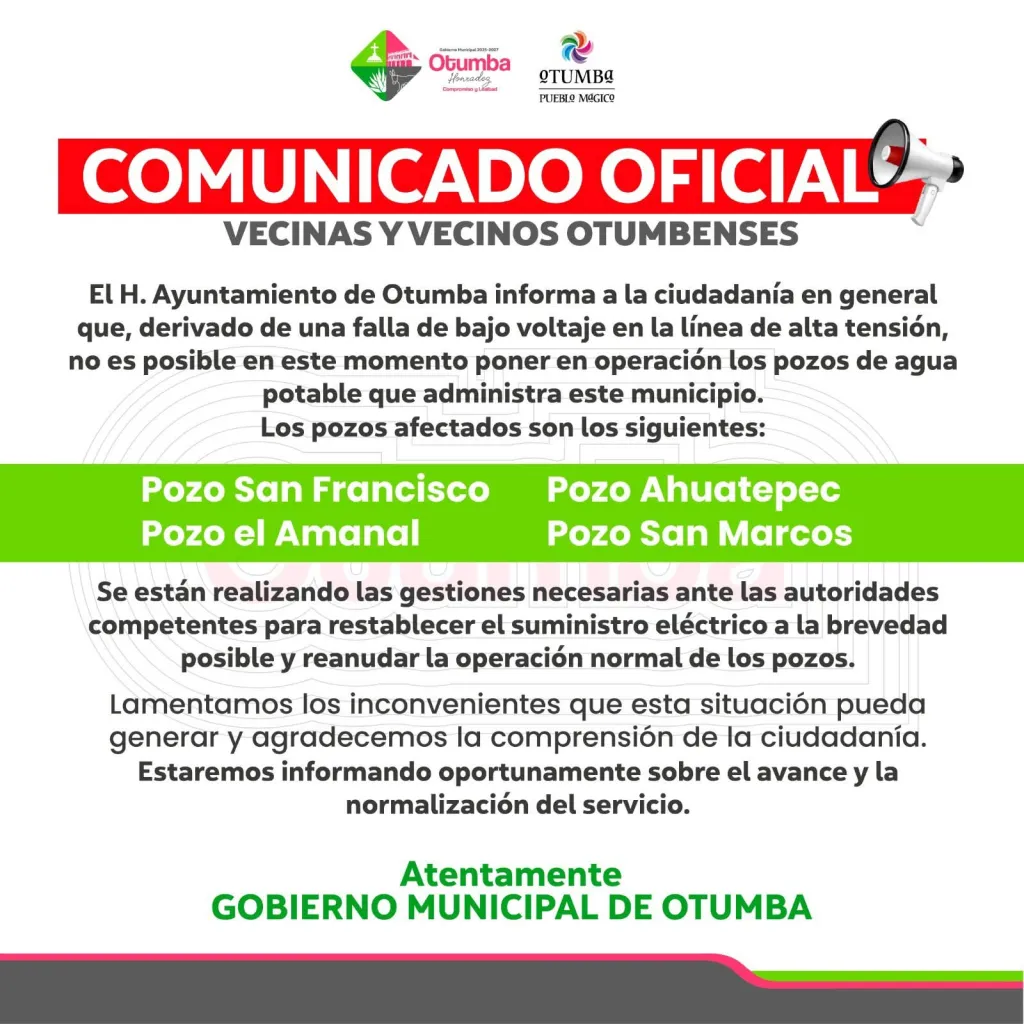 Gobierno local responsabiliza a la CFE por interrupciones en el suministro de agua potable en varias...